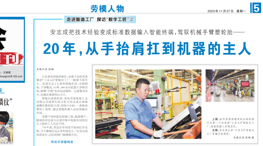 2023 11 30點(diǎn)擊藍(lán)字 關(guān)注“青島城投”(圖為原報(bào)道:《安志成把技術(shù)經(jīng)驗(yàn)變成標(biāo)準(zhǔn)數(shù)據(jù)輸入智能終端,駕馭機(jī)械手臂塑輪胎——20年,從手抬肩扛到機(jī)器的主人》)山東青島西海岸新區(qū),坐落于此的雙星集團(tuán)“工業(yè)4.0”智能化工廠(chǎng)一眼望不到盡頭。走進(jìn)長(zhǎng)達(dá)1公里的智能車(chē)間,光線(xiàn)明亮、干凈整潔,11種、300余臺(tái)機(jī)器人穿梭其間,揮舞“手臂”有序運(yùn)送物料。記者置身其中,仿佛在觀看科幻大片。(圖為安志成操作成型機(jī))智能化成型機(jī)前,青島雙星